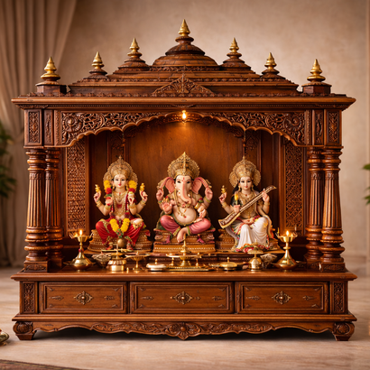 Beautifully carved wooden mandirs crafted with precision detailing, smooth polish, and strong structure for peaceful spaces.